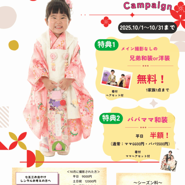 10月からの七五三キャンペーンのご案内です★ ✨10/1(水)~10/31(金)にご撮影のお客様限定!✨お得な「2大特典」をプレゼント! ①【パパママ着物平日50%オフ!】 パパ・ママも着物レンタル・お支度込みでお子さま…
