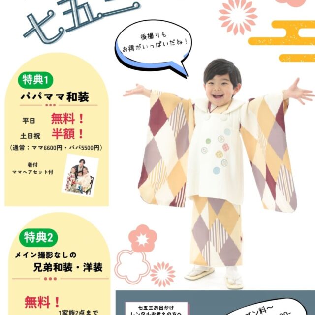 9月からの七五三キャンペーンのご案内です★ ✨9/1~9/30に撮影された方限定!✨お得な「3大特典」をプレゼント! ①【パパママ着物平日無料!】 パパ・ママも着物レンタル・お支度込みで一緒に着物撮影OK!(土日祝...