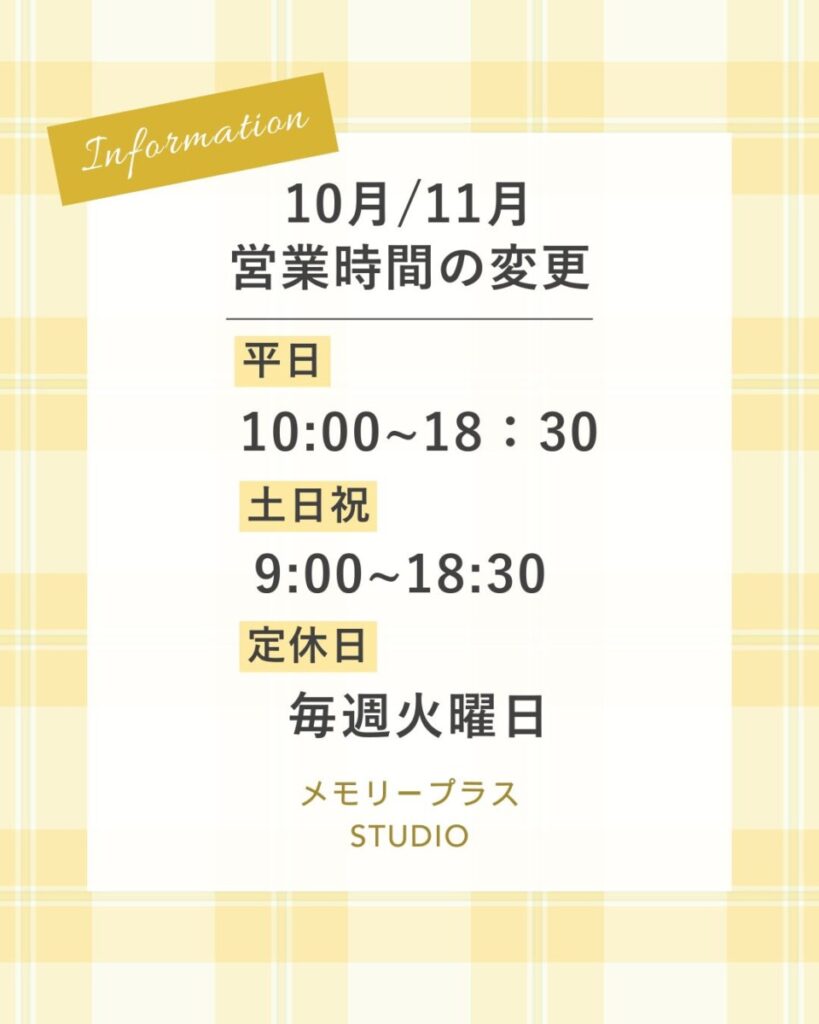 【2025年10月・11月】営業時間・定休日のお知らせ お知らせ 2025.10.03 いつもご利用いただきありがとうございます。10月・11月の営業時間と定休日は下記の通りです。 ~営業時間~ 平日:10:00~18:30 土日祝:9:00~18:30(※土日祝は9:00からの営業に変更となります) ~定休日~ 毎週火曜日 ※第2・第4水曜日は営業します ご来店を心よりお待ちしております。